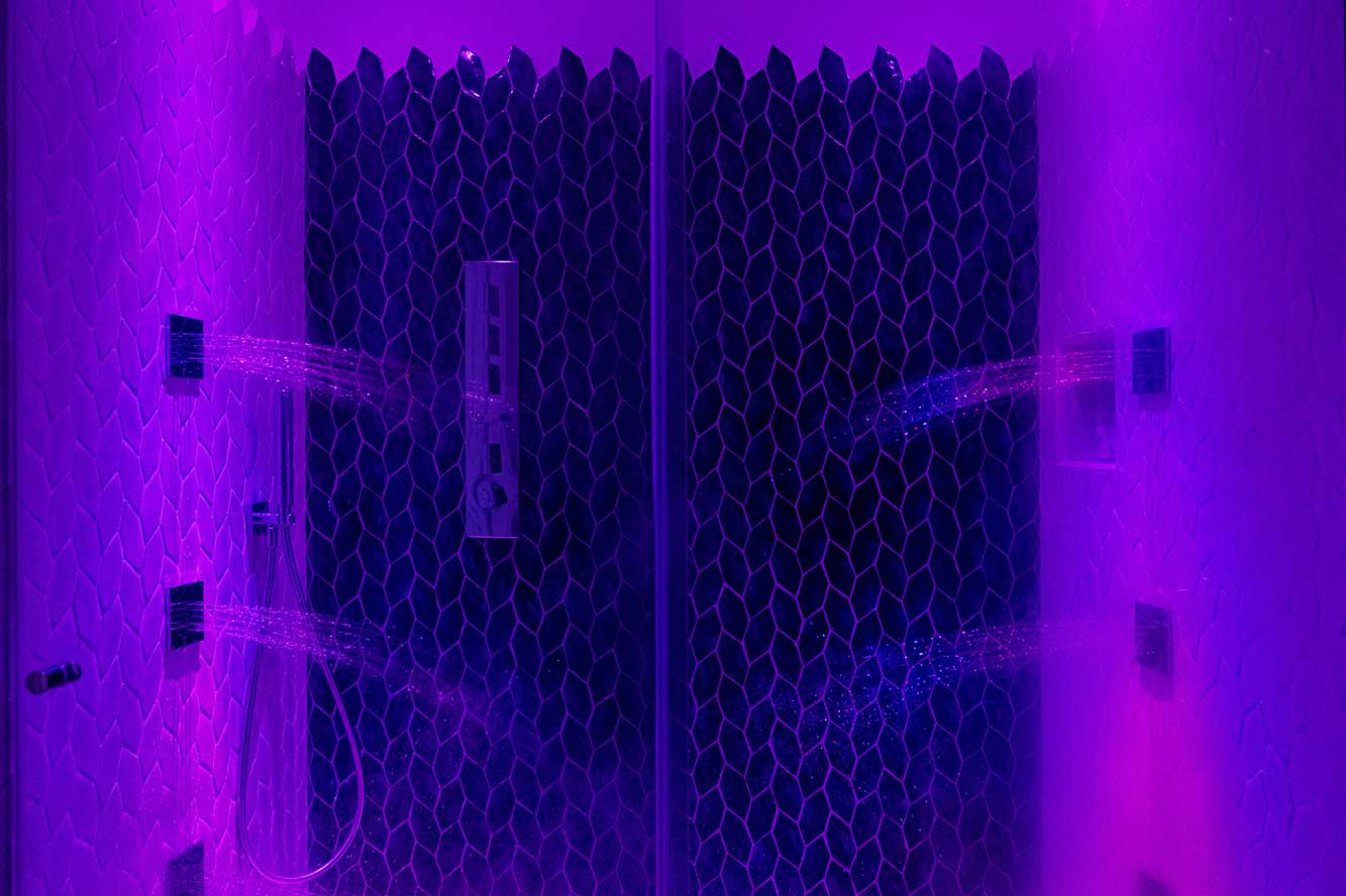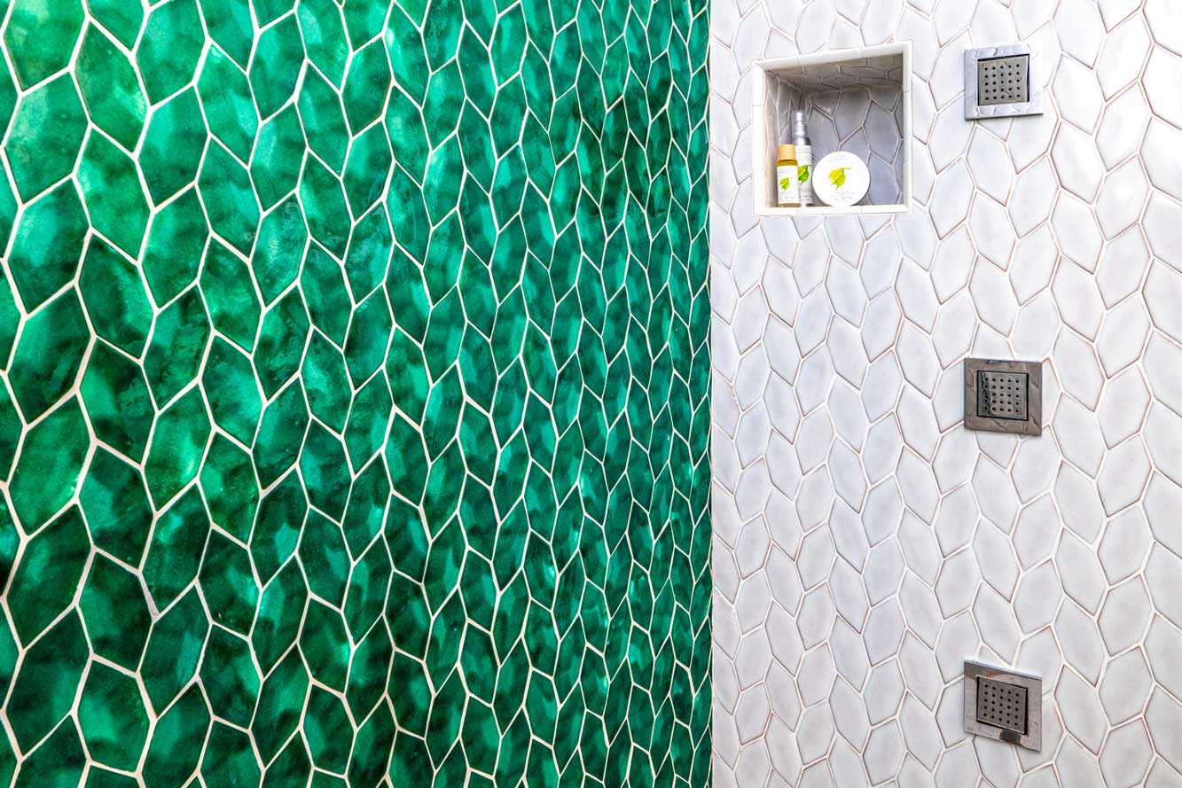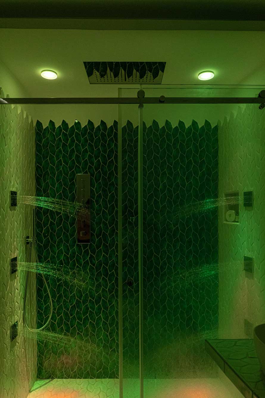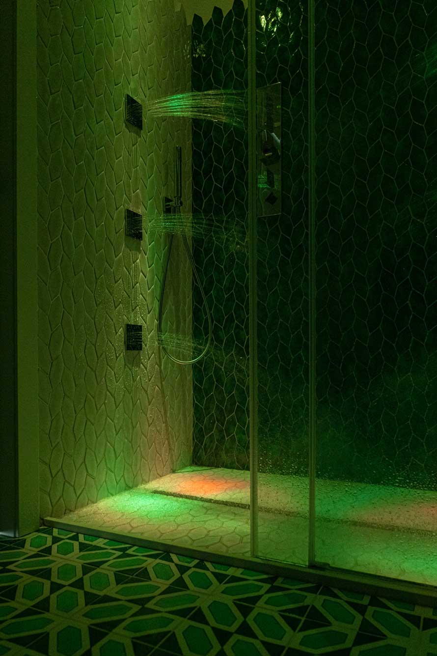The suite expresses the beauty of seafoam with colors that are bright, vibrant, and reminiscent of our own summer days. Inside, you will find custom hand-modeled furniture and handmade riggiole ceramics painted by our local Vietri artists.